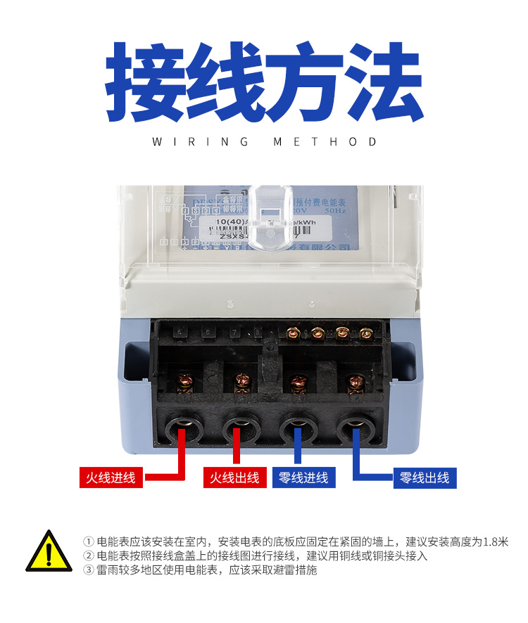 (9)電能表外形和接線方式,接線:第一孔柱進火線和第二孔柱出火線,第三孔柱進零線和第四孔柱出零線